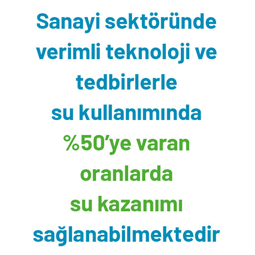 Gibi temiz üretim teknolojilerinin ve verimlilik tedbirlerinin yaygınlaştırılmasıyla sanayide su kullanımında %50’ye varan oranlarda su kazanımı sağlanabilmektedir.