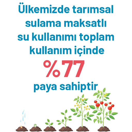 2021 yılında ülkemizde tarımsal sulama maksatlı su kullanımı 45,05 milyar metreküp ile toplam kullanım içinde %77 paya sahiptir.